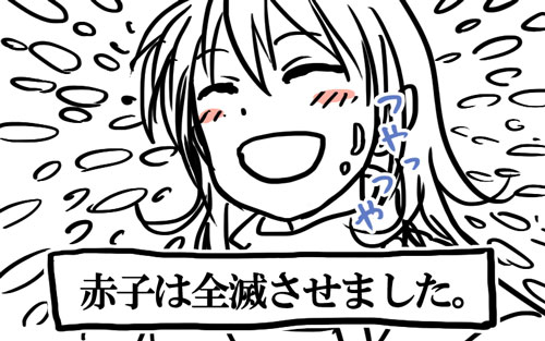 というわけで須賀さんのターン、ここからEDが分岐するみたいなのでセーブしておいて、まずED5から見たいのでまわりを物色せずまっすぐ進みます。赤さんたちは須賀を恐れているので追いかけてきません。いやっほぅ最高にイイ気分だぜ。そしてたどり着いた赤さん数人がわらわらいる場所、話しかけられるので全員に話しかけて進もうと思ったのがいけなかった。