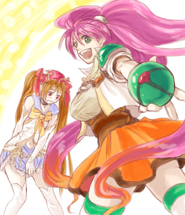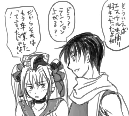 何故この二人がなのかというと、空の軌跡を私はPS3版を買いまして、そのPS3版のパケ絵がHACCANさんでした。私の中でHACCANさんといえば虫姫さまふたりです。そしてちょうど主人公にツインテールという共通点があったのでHACCANさん繋がりと合わせてこの二人を一緒に描いてみたわけです。ついでに衣装も交換して。